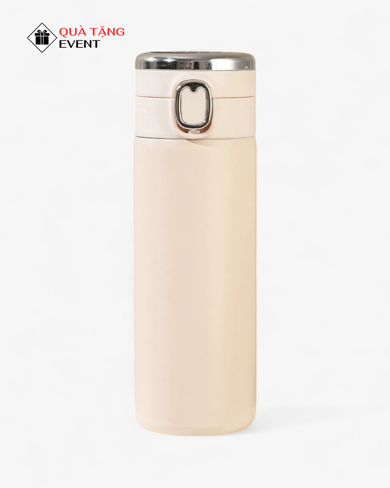 Bình có thiết kế trụ tròn thon gọn, mang lại cảm giác cầm nắm thoải mái và chắc chắn. Điểm nhấn là phần nắp bình được viền kim loại sáng bóng và nút bấm mở tiện lợi, tạo nên vẻ ngoài sang trọng và đẳng cấp. Đây là sản phẩm tiêu biểu cho dịch vụ gia công bình giữ nhiệt theo yêu cầu của chúng tôi.